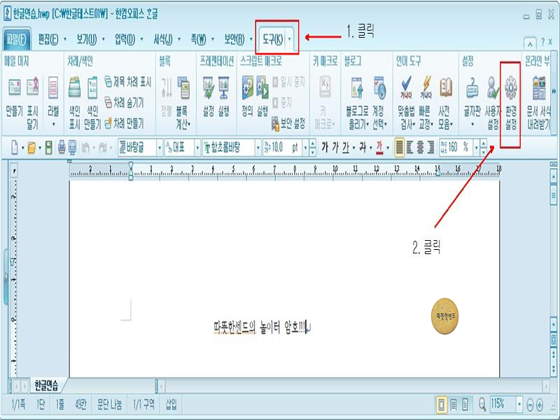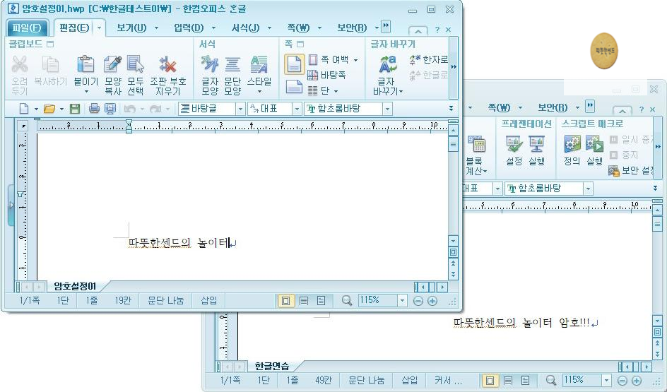 [환경 설정]에서 [새 창으로]를 체크 하였다면 [파일] - [불러오기]를 클릭하여 저장해 두었던 한글 파일하나를 실행합니다. 그러면 파일이 위와 같이 따로 창이 열리는 것을 알 수 있습니다.