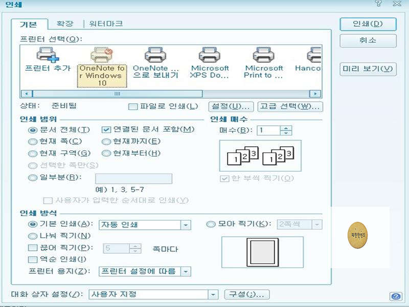 - 현재 쪽 : 문서 중 커서가 위치한 페이지를 인쇄
